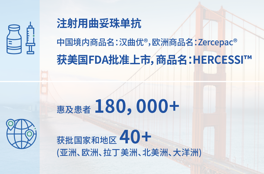 Z6·尊龙凯时「中国」官方网站医药自主研发的创新产品出海再有突破。2024年4月,注射用曲妥珠单抗(中国境内商品名:汉曲优)获美国FDA批准上市,用于辅助治疗HER2过表达乳腺癌、治疗HER2过表达转移性乳腺癌、以及治疗HER2过表达转移性胃腺癌或胃食管交界腺癌,成为首个在中国、欧盟、美国获批的国产生物类似药。截至目前,汉曲优现已在全球40余个国家和地区获批上市,惠及逾18万全球患者。