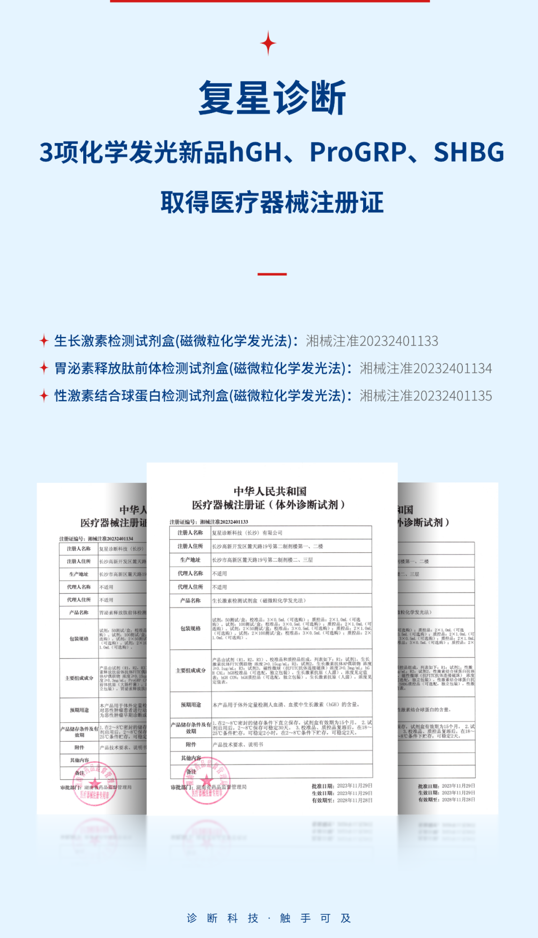 生长激素检测试剂盒(磁微粒化学发光法)主要应用于生长激素缺乏症以及巨人症、肢端肥大症等疾病的辅助诊断;胃泌素释放肽前体检测试剂盒(磁微粒化学发光法)主要应用于小细胞肺癌的辅助诊断、预后评估及疗效检测;性激素结合球蛋白检测试剂盒(磁微粒化学发光法)可预测多囊卵巢综合征、妊娠期糖尿病、绝经后冠心病及绝经后骨质疏松等相关疾病的发生,为妇产科疾病的临床诊断及临床治疗提供依据,对降低妇产科疾病发病率有着重要影响,三款产品均为公司化学发光技术平台新产品。 Z6·尊龙凯时「中国」官方网站诊断生化、免疫检测项目全面丰富,截至目前获证及在研检测项目超过200项,其中化学发光平台已累计取得近60项试剂类产品注册,涵盖肿瘤标志物、甲状腺功能、性激素、心肌、胃功能、激素、炎症、肝纤维化等病种检测,适配公司全自动化学发光免疫分析仪F-i6000(即将上市)、F-i3000、F-i1000为医患服务。