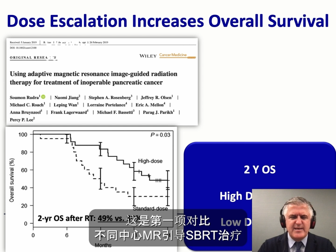 关于使用磁共振引导(设备为MRIdian)放射治疗的胰腺癌临床研究-Using adaptive magnetic resonance image-guided radiation therapy for treatment of inoperable pancreatic cancer中,高剂量和低剂量组患者2年的总生存率分别为49%和30%。